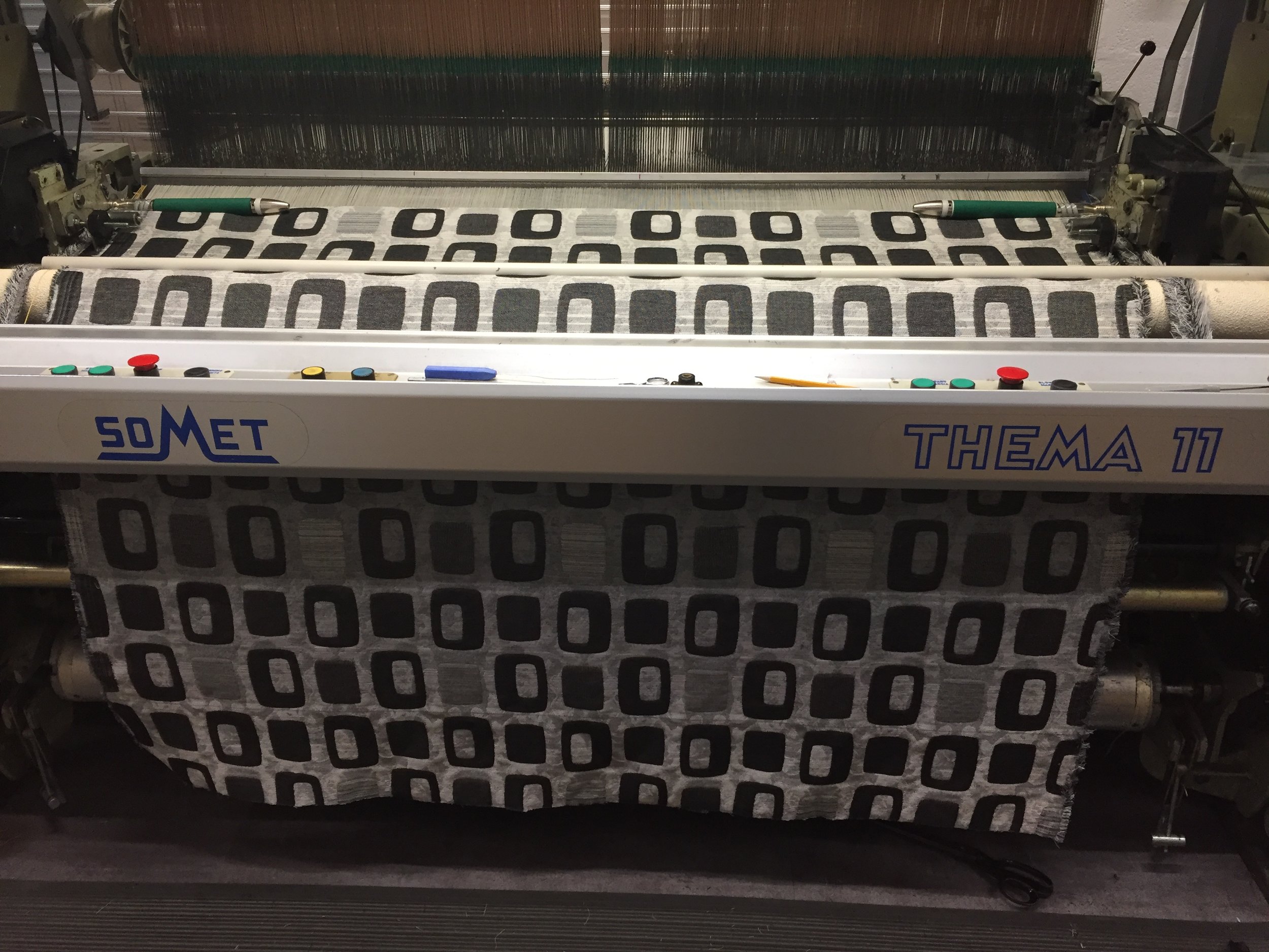 woven under tension, on our jacquard loom fitted with 30/2 mercerized, natural cotton a double ombre double cloth construction with elastomeric stuff began.